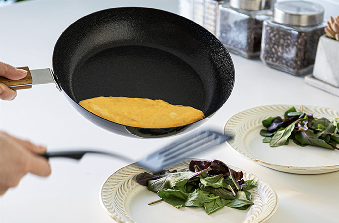 焦げつきやこびりつきを防ぎ、調理する素材との接触面を最小限にする「ファイバーライン加工」のおかげで、オムレツはもちろん、さまざまな料理をおいしく仕上げてくれます。