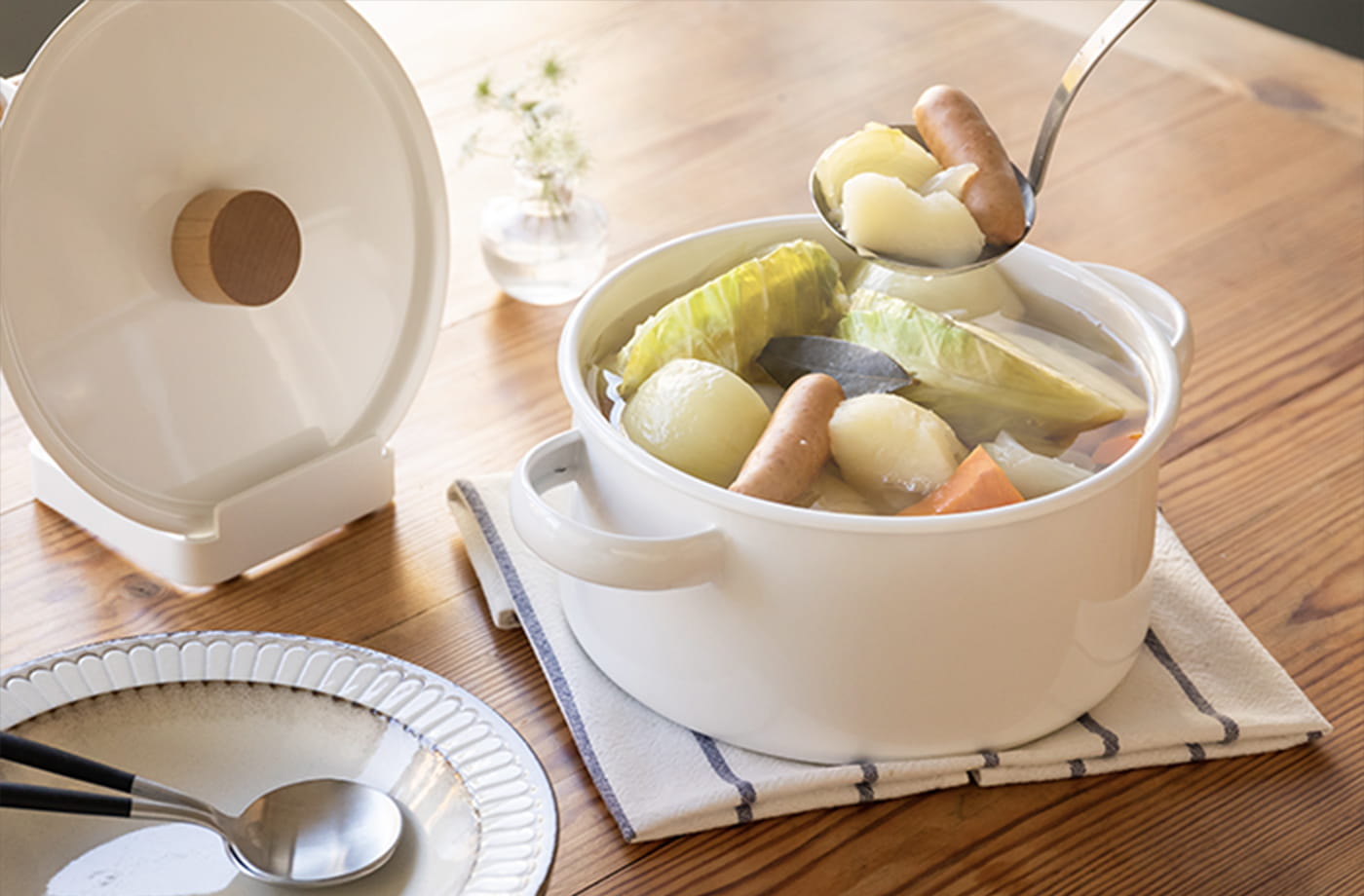 調理後、食卓にそのまま出してもサマになりそうなホーローの「両手鍋」。ポトフやシチュー、カレーなどの煮込み料理におすすめです。