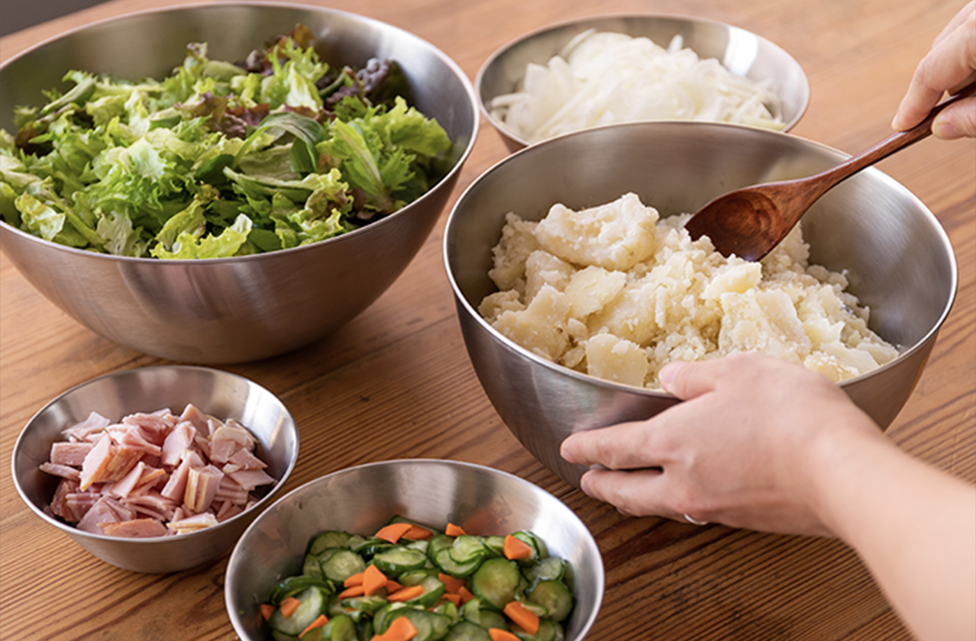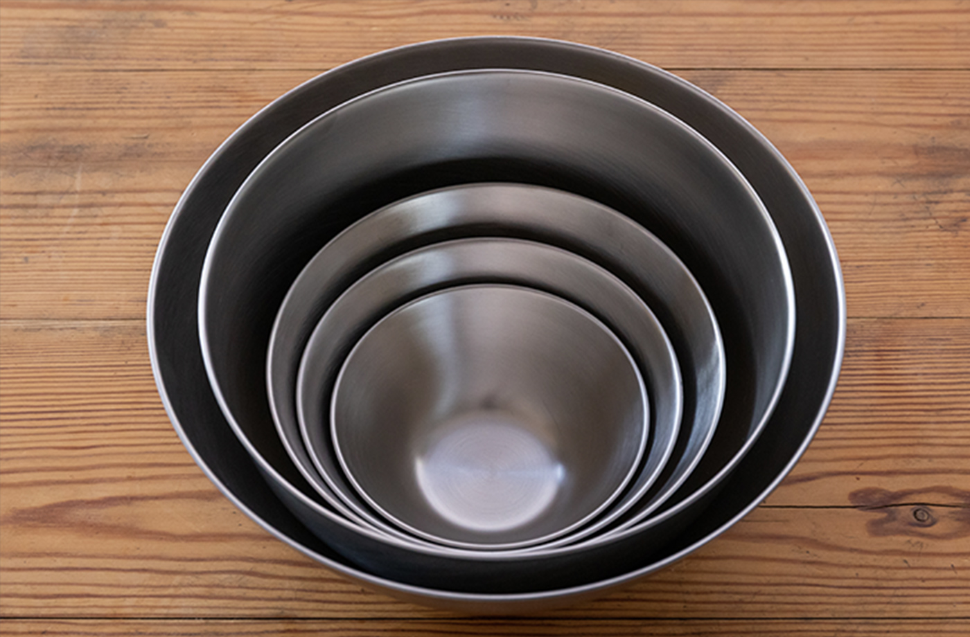 これらのステンレスボウルもまさにそのひとつ。料理研究家や多くの主婦の声をもとに研究を重ねたというデザインは、シンプルで美しく、使いやすさ抜群です。