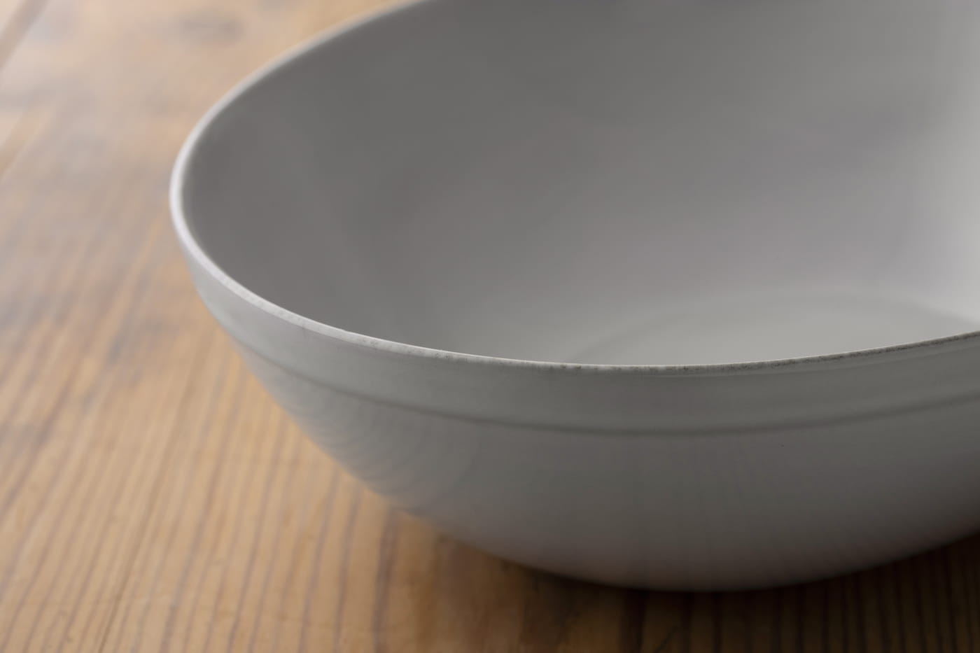 ご紹介したマグカップと同じシリーズの器がこちら。水彩絵具を水に溶かし、紙に描いたときにできる“美しいにじみ”を、釉薬で表現しています。均一ではない、色の繊細な表現は、職人の手仕事だからこそ生まれる賜物。温かみのある優しいすみれ色と、飽きのこないシンプルなデザインの器は、きっと長くお使いいただけるはずです。